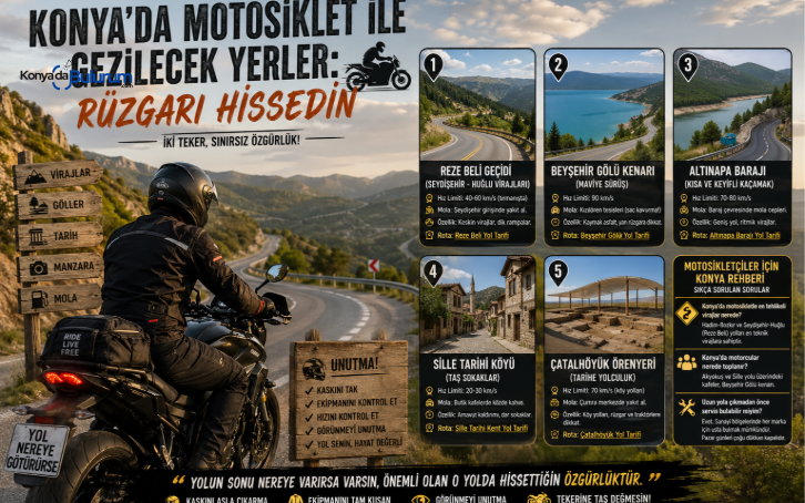 Selamlar yol arkadaşım, kaskını takıp vizörünü indirdiğinde dünyanın tüm derdini geride bırakan o güzel insan! İki tekerin üzerindeyken rüzgarın şarkısını dinlemek, motor bloğunun sıcaklığını bacaklarında hissetmek ve her virajda yolla bir olmak gibisi var mı? Hele bir de rotanız Konya ise, şanslısınız. Çoğu kişinin aklına Konya denilince uçsuz bucaksız, dümdüz ovalar gelir. Ancak bir motosikletçi için bu coğrafya, Toroslar'ın keskin virajlarından, masmavi göl kenarlarına, binlerce yıllık antik kentlerden yemyeşil baraj yollarına kadar inanılmaz sürprizler saklar.